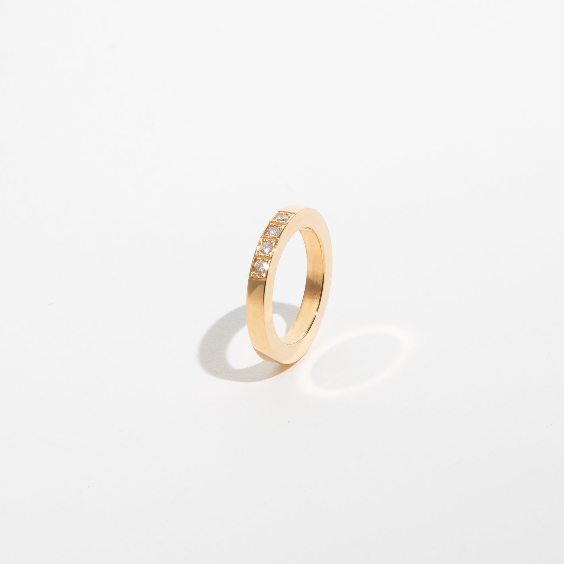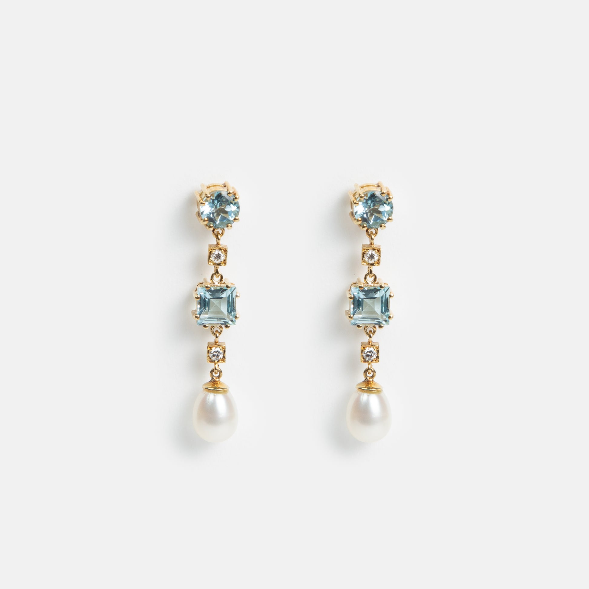A minha querida cliente Marta comprou uns brincos muito especiais num leilão que encurtei para se tornarem neste par mais contemporâneo. Aproveitei um dos dois topázios azuis e quatro dos oito diamantes que sobraram para criar o fecho de palheta de ouro amarelo de 19,2 kt. Por fim, um anel para uso diário em ouro amarelo de 19,2 kt feito com outros quatro diamantes. O design de todas as peças foi feito em conjunto com a cliente, como eu gosto de trabalhar.