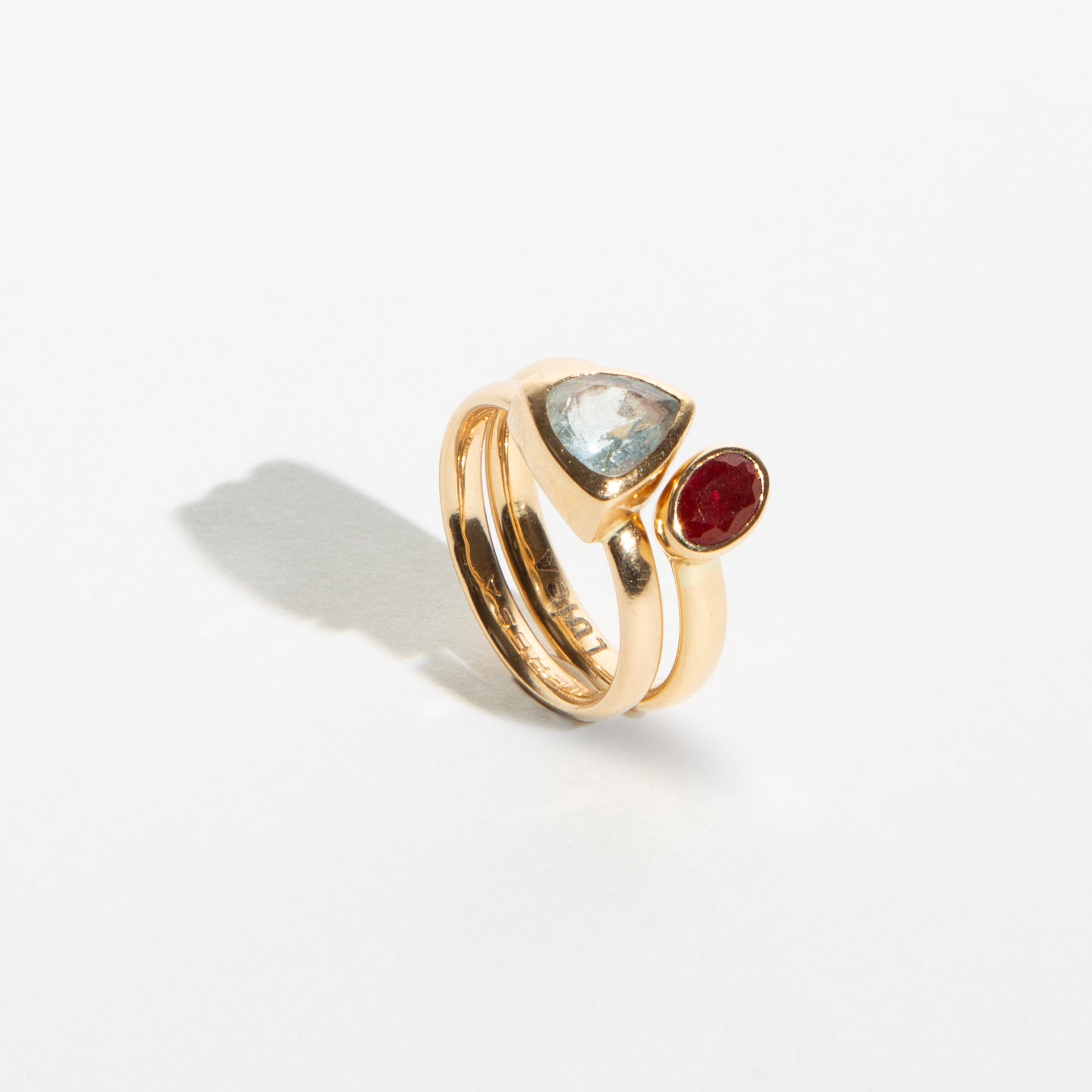 Um anel tão especial como o momento que celebra. Para o nascimento da segunda filha, Luísa, o marido encomendeu um novo anel que encaixasse no primeiro anel - feito à medida por mim para a primeira filha. Assim sendo, à água-marinha de março junta-se agora o rubi de julho. Este anel pode ser usado também individualmente, transformando-se em dois anéis, cujo propósito será oferecer à respectiva filha quando crescer.